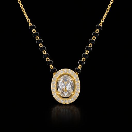 Redefine traditional grace with this exquisitely crafted Halo Pendant Mangalsutra. The focal point is a stunning oval-cut centerpiece, surrounded by a shimmering halo of pavé-set stones that amplify its brilliance. The pendant is suspended from a delicate gold-plated chain, accented by a sequence of classic black beads that symbolize protection and prosperity. With its high-polish finish and minimalist silhouette, this piece offers a sophisticated way to wear a meaningful symbol every day.