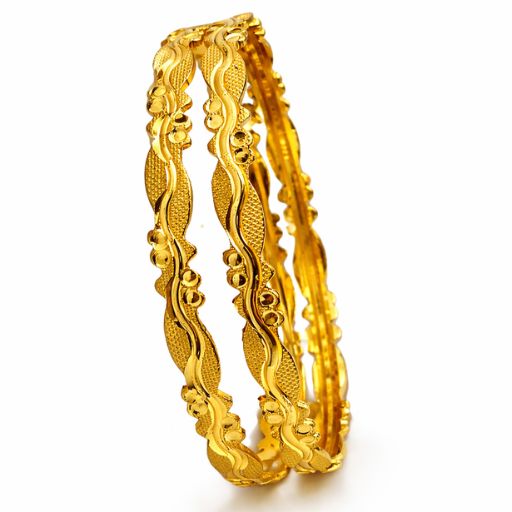 Command attention with these wave-contoured gold bangles. This set of two showcases a unique scalloped edge design, meticulously crafted to follow a soft, undulating path around the wrist. Each “wave” is finished with a sophisticated matte-frosted texture, accented by high-polish gold floral and spherical motifs that appear to float along the surface. Precision-engineered for a comfortable fit, these bangles offer a bold, sculptural look that remains lightweight and elegant for any occasion.