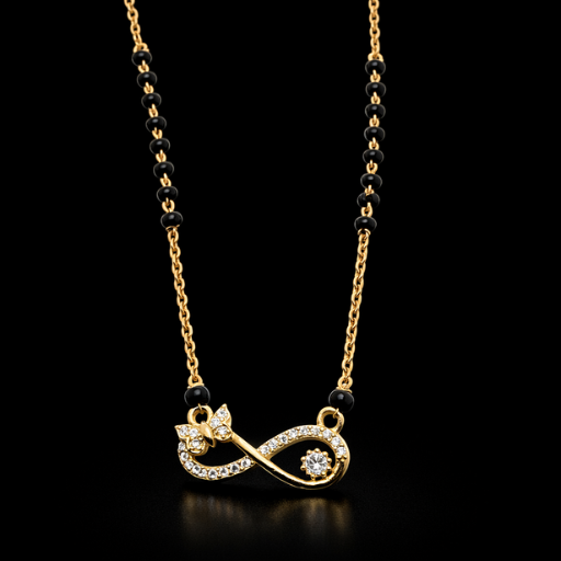 Redefine tradition with the Infinity Butterfly Mangalsutra, a piece that captures a sense of graceful movement. The pendant features a polished infinity loop intricately set with a shimmering path of pavé crystals. Perched elegantly at one end is a delicate butterfly charm, while a brilliant round-cut stone sits nestled within the opposite loop, adding a focused spark of light. Suspended from a dainty gold-plated chain with streamlined black bead accents, this necklace is a lightweight and soulful celebration of love and growth.