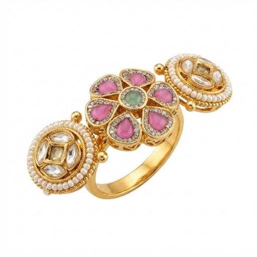 Add a rich and festive touch to your look with this beautifully crafted gold plated floral necklace set. Designed with intricate detailing, this set features a graceful necklace with a bold statement pendant highlighted by red and green accents, along with matching earrings for a complete traditional look.