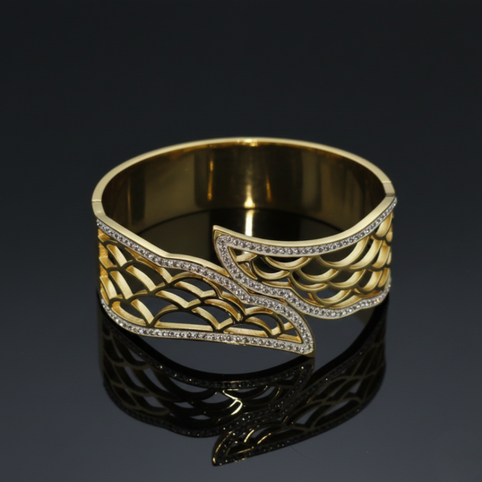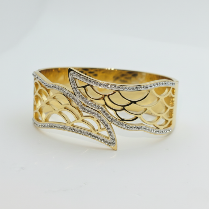 Luxury Gold-Tone Open Cuff Bracelet with Diamond-Studded Leaf Motif | Premium Designer Statement Bangle for Women