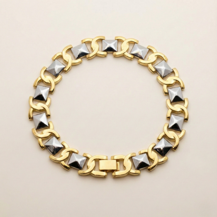 Men’s Two-Tone Pyramid Link Bracelet – Gold & Silver Geometric Studded Chain – Edgy Industrial Punk Style Statement Jewelry Gift for Him