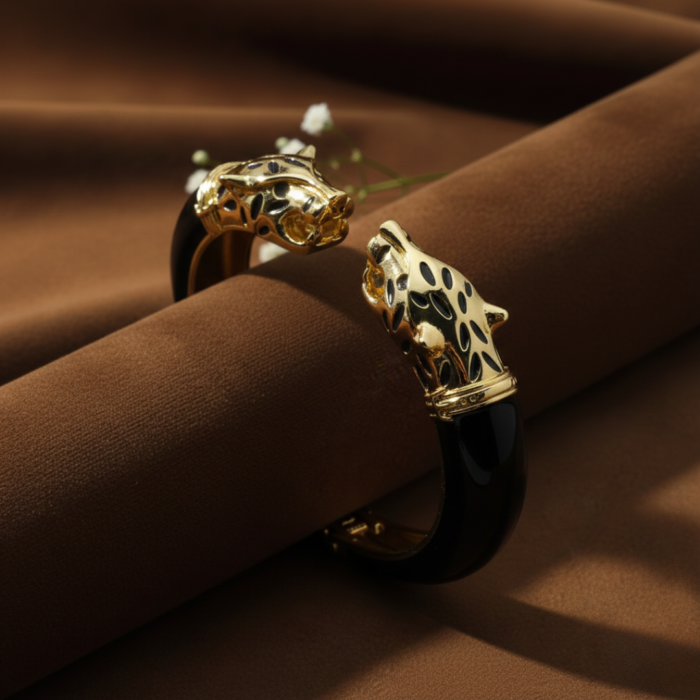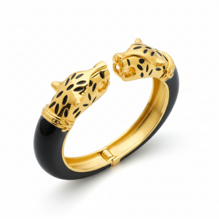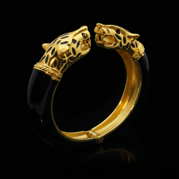 The Royal Panther: Gold & Black Enamel Hinged Bangle – Statement Jewelry